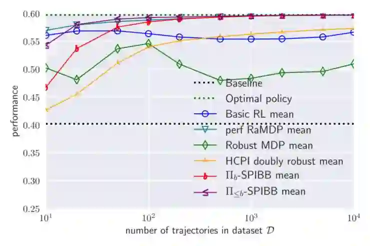 这张图是算法可靠性的测试结果,即 1%-CVaR 最糟糕的 1% 情况中的表现。可以看到,经典强化学习是不可靠的,表现显著低于基准算法;SPIBB 的可靠性遥遥领先;RaMDP 在数据较少时稳定性表现不佳。研究人员们在其它的随机环境、随机基准算法条件下的实验也得到了类似的结果。在论文中,作者们也对 SPIBB 在有限 MDP 中的可靠性进行了严格的证明。