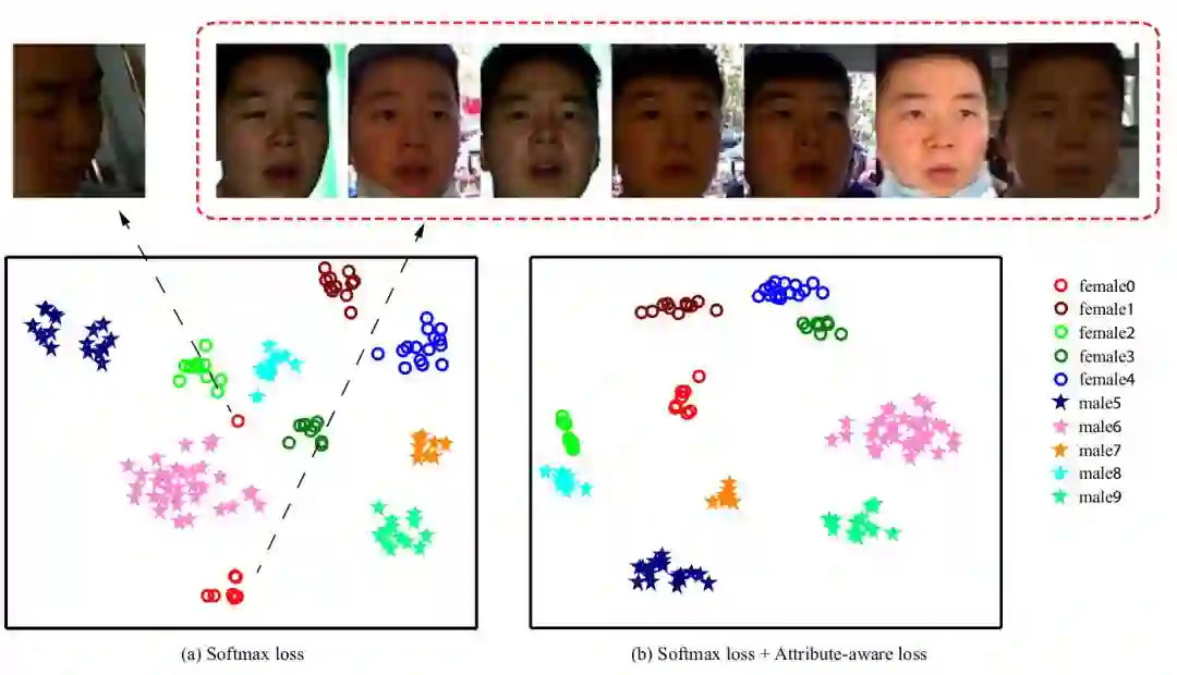 本文为基于卷积神经网络的人脸识别提出了一种属性感知损失函数。该函数可以根据额外的属性信息(比如年龄,性别和民族)来调整人脸特征向量在高维空间中的分布(可见图3)。更具体地,利用属性之间的差异来线性逼近人脸特征向量之间的差异,使得具有相似属性的人脸图像对应的人脸识别特征也是相似的,从而改善人脸特征映射的学习过程。