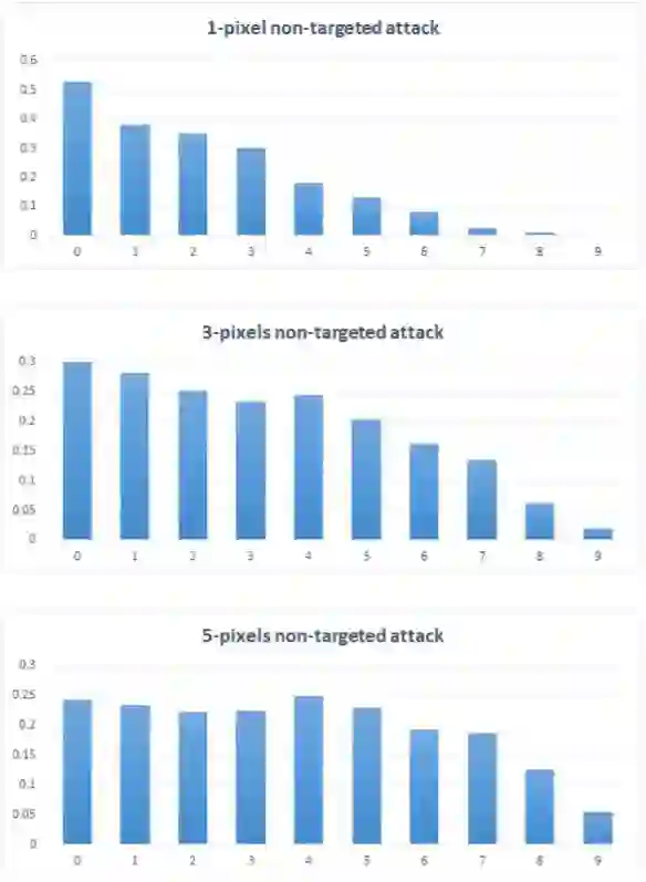 使用少数像素扰动能高效地实施非靶向攻击。研究发现仅需要修改 1 个像素,就可将 73.8% 的图像扰动至一个或多个目标类别,在修改 3 个像素和 5 个像素的情况下,比例分别为 82.0% 和 87.3%。这表明不敏感的图像比敏感图像更加稀少,即使扰动已经被限制在这么小的范围内。因为少数像素修改是搜索对抗图像的有效方法,而这种图像在实践中不易被人眼识别。