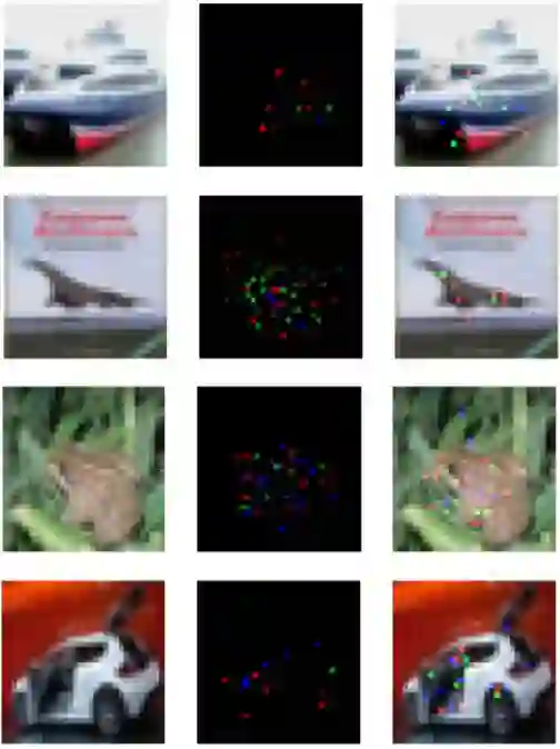 这篇论文的作者认为少数像素攻击的实现有两大原因。1)实践中,少数像素攻击可以有效隐藏修改。之前的研究无法保证扰动完全不可见。解决这个问题的一个直接方法就是尽量限制扰动的幅度。具体来说,就是不使用理论提出的额外约束或考虑更复杂的扰动成本函数,而是控制修改的像素数量,如在一个 32 X 32 的图像中修改 1、3 和 5 个像素,即使用像素数量而不是扰动向量的长度来衡量扰动的强度。2)从几何的角度来看,多个之前的研究通过限制像素修改来分析自然图像的周围(vicinity)。例如,通用扰动向每个像素添加小的值,使之在自然图像周围的球形区域中搜索对抗图像 [24]。另外,少量像素扰动可以使用维度非常低的子空间来削减输入空间,这也是一种探索 DNN 输入空间特征的不同方法。