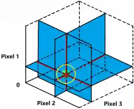 图 3:在三维输入空间中(即图像有 3 个像素),使用 1 个和 2 个像素扰动攻击的示意图,绿点表示一个自然图片进行扰动。在一个像素进行扰动时,搜索空间为自然图像三条相交线,且每一条线都相互垂直,图中用红线和黑线表示。在 2 个像素的情况下,搜索空间为三个二维相交平面,且每一个平面都相互垂直,图中用蓝色平面表示。总而言之,1 个和 2 个像素攻击搜索了 3 维输入空间中 1 维和 2 维子空间内的扰动。此外,黄圈表示使用 L^p 范数正则化前面定义的搜索空间以控制总体的修正空间。相比之下,少量像素攻击可以搜索更多的区域。