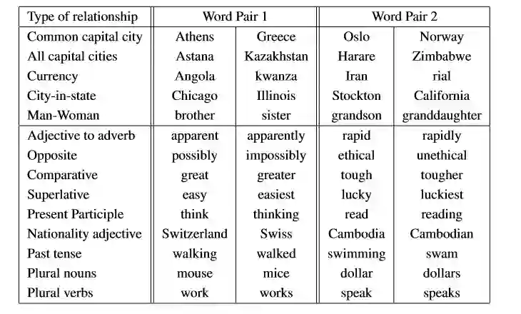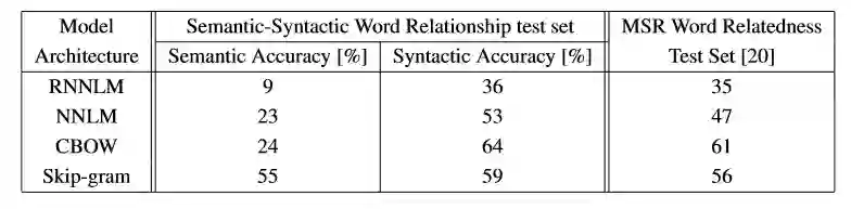 如下表所示,论文中设置了5种语义问题与9种句法问题来测试向量效果,通过类似vec(big)-vec(bigger)≈vec(small)-vec(smaller)的方式来判断。