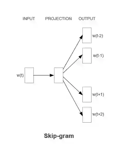 第二种模型结构是Skip-gram(Continuous Skip-gram Model),其思想与CBOW相反:利用中心词预测中心词上下文的n个词(n可自定义),如上图所示,利用中心词预测上下文各2个词,输入层直接等价变化到投影层,然后预测上下文的词。整体公式可以直接表示为: