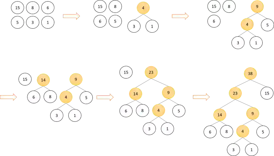 给定n个结点,每个结点都有一个权重,构造一棵二叉树,如果它的带权路径长度最小,则称为最优二叉树,也称为Huffman树。给定n个值 作为n个结点的权重,可以通过下面方法构造huffman树: