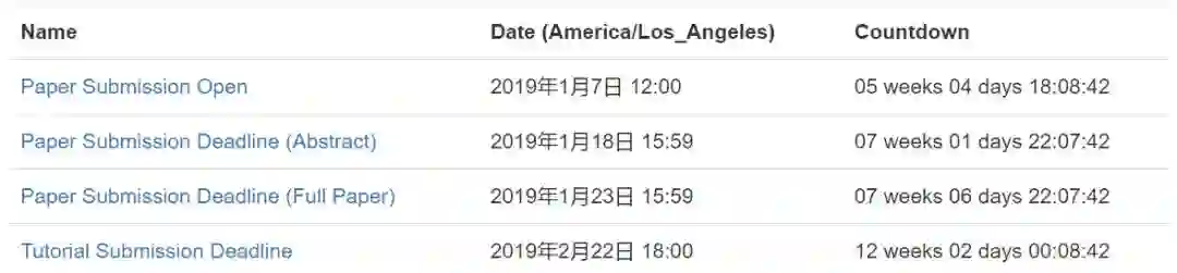 论文提交的开始时间,论文摘要的提交 deadline,full paper 的提交 deadline,以及教程提交 deadline。注意这里显示的是太平洋时间,太平洋时间 2019 年 1 月 7 日 12:00 对应北京时间 2019 年 1 月 8 日 4:00。