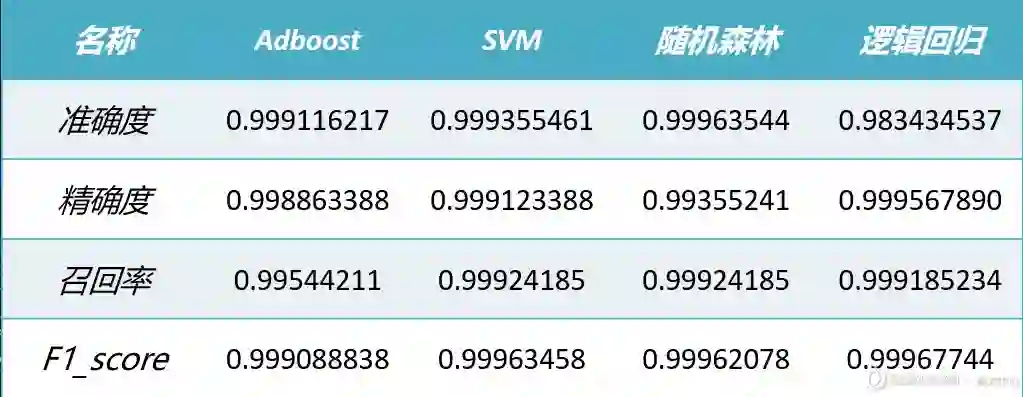 选取了adboost、SVM、随机森林、逻辑回归四种算法进模型训练,其中正常流量60349条,webshell流量51070条。各模型训练效果对比如下图5所示。综合考量到最小化算法运行时间,和最大化可解释性,在多个算法检测效果相似情况下,选择随机森林作为实际产品化使用的模型算法。