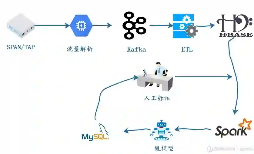 将基于机器学习的Webshell检测部署到生产环境中,需要考虑大数据规模对模型的时效性、吞吐量等性能指标的影响。经多方考量,最终选用如下图7所示的组件搭配作为产品化的技术选型。此方案结合了spark大数据处理的高效性,Kafka对数据流动的中高性能低延迟性,Hbase对对大规模数据集的实时读性访问性。采用下图中技术架构,可保证大流量环境中对Webshell的检测,和机器学习模型的自动优化。