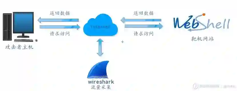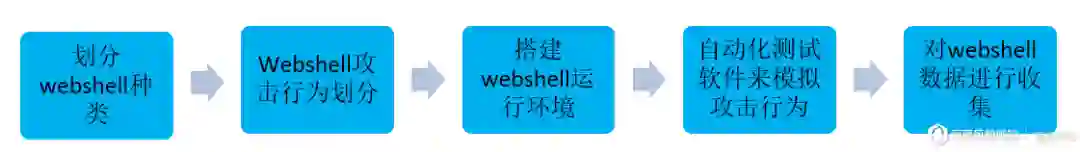 在真实的环境中webshell样本缺少,基本在数万条的http流量中,都难有一条webshell所产生的流量。因此对于机器学习来说,高质量、多数量的的样本将会是个挑战。为了解决这个样本难的棘手问题,我们特意模拟搭建了webshell入侵的环境,按照webshell的种类、攻击的行为写好自动化脚本,运行时产生大量webshell流量,使用网络嗅探工具(如Wireshark,Tcpdump等)收集了Webshell流量。 如图1基本展示了整个数据采集的流程。