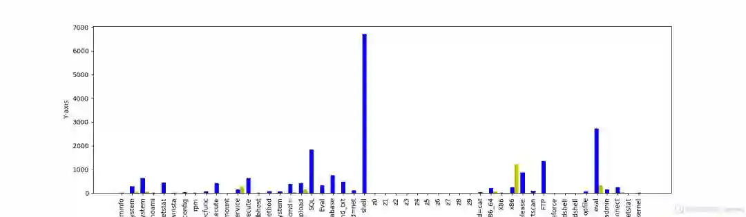 对于webshell本身的行为分析 ,它带有对于系统调用、系统配置、数据库、文件的操作动作,它的行为方式决定了它的数据流量中多带参数具有一些明显的特征,另外再关键词匹配之前先对流量进行decode操作。查阅各类webshell操作方式,以及观察了所产生的数据流量进行统计分析后,共采集了部分关键词罗列如图4。经统计发现这些关键词在正负样本中出现的占比十分悬殊,因此作为特征是非常合适的。以下是正负样本中关键词出现次数的对比条形图(如图4),可以显示出分布差异。