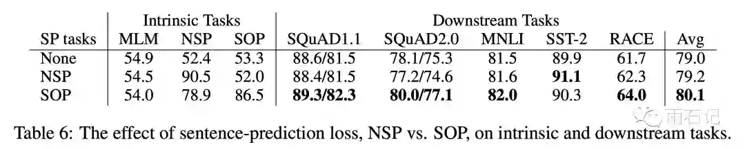 不同的句子损失的影响如下图,SOP是sentence order prediction的缩写。可以看到SOP训练好了,NSP结果自然也好,反之则没有。所以SOP是NSP的比较好的扩展。