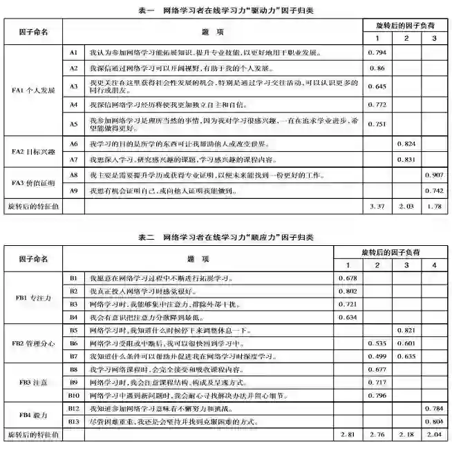 综合理论分析、专家论证及数据分析检验,本文首先构建了在线学习力模型,并针对网络学习者在线学习力进行探究式因子分析,最终得到网络学习者在线学习力量表,由学习驱动力、顺应力、策应力、反省力、互惠力五个维度组成,共56个题项。在这个量表中,学习驱动力、反省力、互惠力是一般性维度,顺应力、策应力是特殊维度。这个框架与编制的学习力量表结构一致。学习内驱力是网络学习者在线学习的动力系统,顺应力是在线学习的方法系统,策应力、反省力是在线学习的调节系统,互惠力是在线学习的激发系统。基于上述能力模型开发的在线学习力自评量表,经过多轮迭代与试用验证,证明具有良好的信度与效度,可以作为网络学习者的在线学习力测评工具。