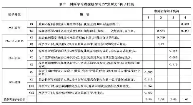 学习策应力维度原有13道题,本研究依据探索性因素分析结果删除了第13题与第11题,对剩余11个题项进行第三次探索性因素分析,提取出的4个共同因素(可以解释测量题项85.9%的变异量),分别为推理、建立联系、想象、提问(见表三)。C2在2和4两个因子上负荷较高,虽应优先选择因子2,但专家研讨认为C2属于提问范畴,因此C1、C2两题归到“FC1提问”要素。C3属于思考现象与本质的联系,C4属于探究已知与未知、理论与实践间的联系,这两题均归于“FC2建立联系”要素。C7题项叙述清晰,指运用想象策略进行在线学习,C5、C6两道题虽未直接指出想象,但表达了利用知觉获取新经验的含义,且因子归类结果也属于想象范畴,专家讨论认同将这三道题归到“FC3想象”范畴。C8考察的是建构观点,C9考察的是推理演练,C10和C12考察的是修正和完善观点,根据探索性因素分析结果,这4个题项均归到“FC4推理”。