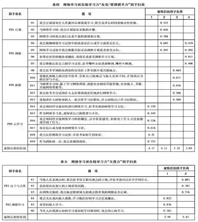 学习反省/管理调节力原有19道题,研究者依据探索性因素分析结果删除了第9题,对剩余18个题项再次进行探索性因素分析,提取出4个共同因素(可以解释测量题项81.4%的变异量),分别为计划、调整、提取、元学习(见表四)。D1-D3属于学习者在线学习时的计划工作,归到“FD1计划”。D4、D5题在两个因子上负荷均过高,为谨慎起见,专家组研讨认为D4预测学习收获与成果不属于学习计划范畴,而是对学习过程的把控,应归到“调整”。D5题项表意明确,属于调整学习计划,也归到“调整”。D6、D7表意明确,属于调整学习计划与进度,专家组将D4-D7四道题项归到“FD2调整”要素。D8、D10两题属于在学习过程中进行思考,提取所需信息,D11属于利用资源获取信息,D12、D13表达了思考何种方法策略适用于学习。这五道题项均属于学习者在线学习中利用学习策略改进学习、做自己学习的教练,专家组将其归到“FD3提取”。D14-D16表达了学习者在线学习中思考如何学习的过程和方法,D17-D19描述了学习者对自身学习的态度,这六道题项表意明确,均属于“FD4元学习”范畴。