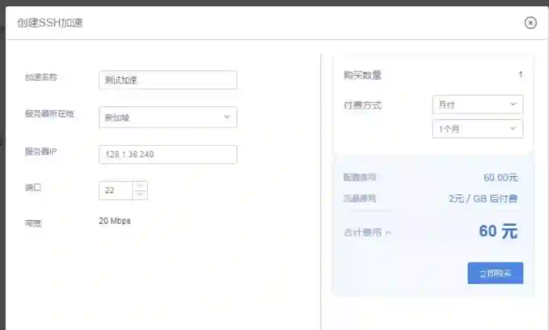 一个GlobalSSH实例的费用仅需60元/月,所产生的流量费用为2元/GB,(根据当日流量使用情况于次日凌晨结算,不足1GB免费)。除此之外,用户还可以根据自己的实际需要,灵活选择年付/月付/按时付费。
