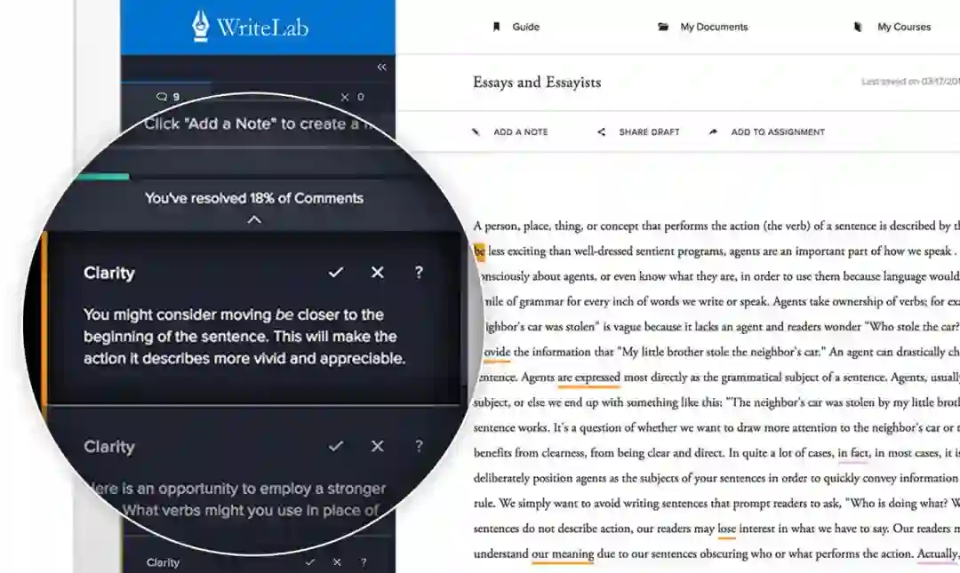 WriteLab可分析作者的草稿,并且不仅可提供修改和编辑,亦会提出问题和建议,鼓励学生在决定他们想表达的话语以及他们想如何表达的过程中学习。