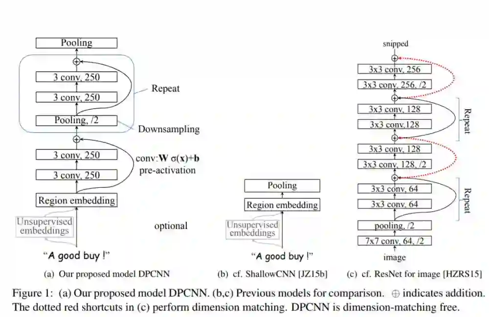 同时DPCNN的底层貌似保持了跟TextCNN一样的结构,这里作者将TextCNN的包含多尺寸卷积滤波器的卷积层的卷积结果称之为Region embedding,意思就是对一个文本区域/片段(比如3gram)进行一组卷积操作后生成的embedding。