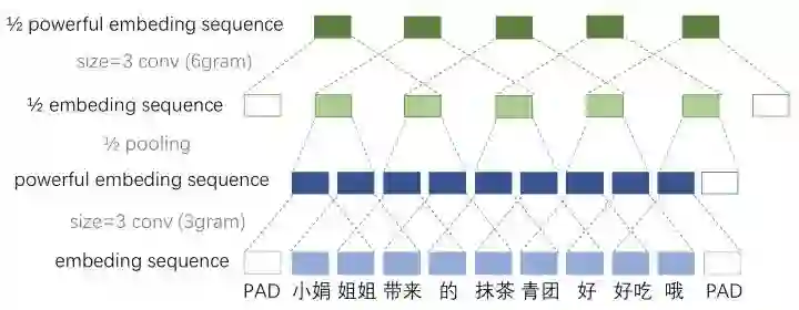 例如之前是只能感知3个词位长度的信息,经过1/2池化层后就能感知6个词位长度的信息啦,这时把1/2池化层和size=3的卷积层组合起来如图所示。