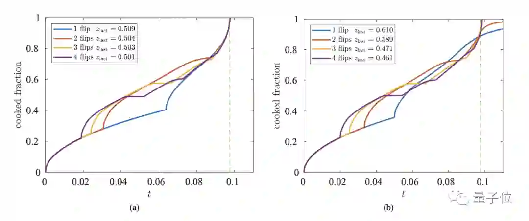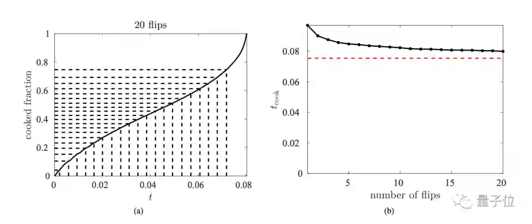 首先,在最优翻转次数——20次——情况下,最佳烹饪时间趋近于63秒,而单次翻转时间为80.5秒,相比之下可以将烤制时间减少29%。