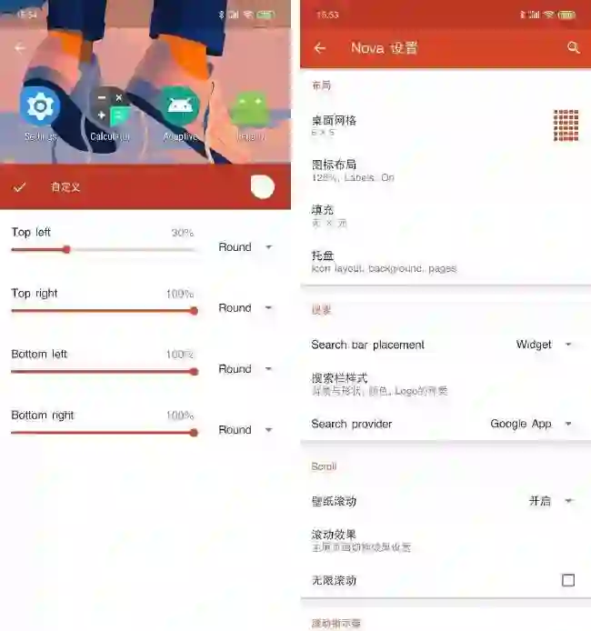 另一方面,随着自适应图标(Adaptive Icons)的引入,我们在装点主屏时需要考虑的细节也更多了。试想一下,当你把图标统一设定成了圆角矩形,装着不少应用图标的文件夹却依然是默认的圆形……Nova Launcher 6.0 不仅正式支持了文件夹图标和应用图标的形状关联,应用抽屉中的搜索栏样式也能像主屏搜索栏那样进行自定义了。