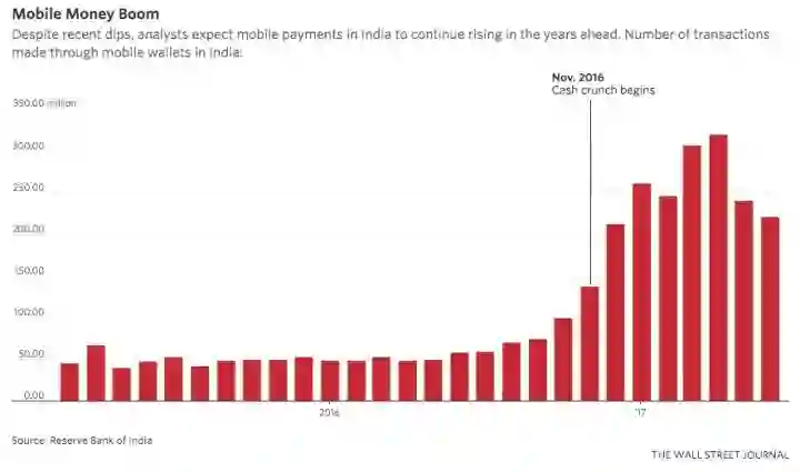 当印度政府去年突然取消了86%的流通货币,以打压腐败和逃税行为后,Paytm迅速走红。Paytm服务登陆各家商户,到处都是带有Paytm Logo和二维码的贴纸。印度绝大多数商户不接受信用卡,因为他们缺少刷卡机。在此推动下,Paytm用户量飙升。