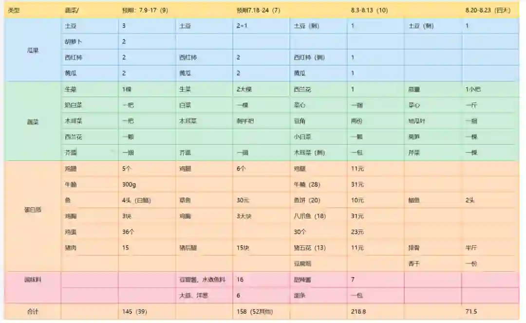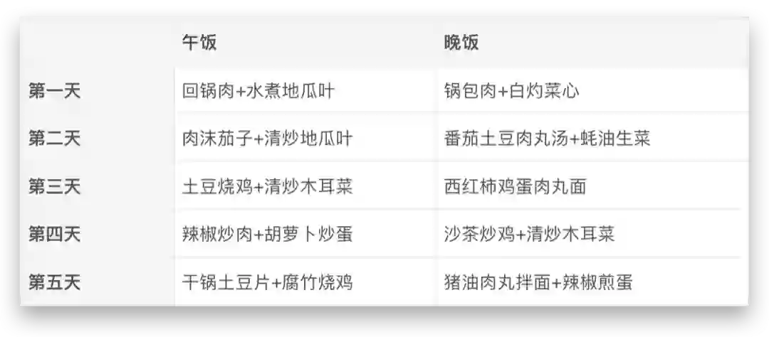 上文食材每天每顿煮两道常规分量的菜,我和室友两个人吃了五天左右(我和室友都算是吃菜量比较大的,如果是两个吃菜正常水平的人,这些食材吃七天应该是没有问题的),其中早餐我都是煮面,所以不会怎么消耗食材。五天具体的餐谱如下表。