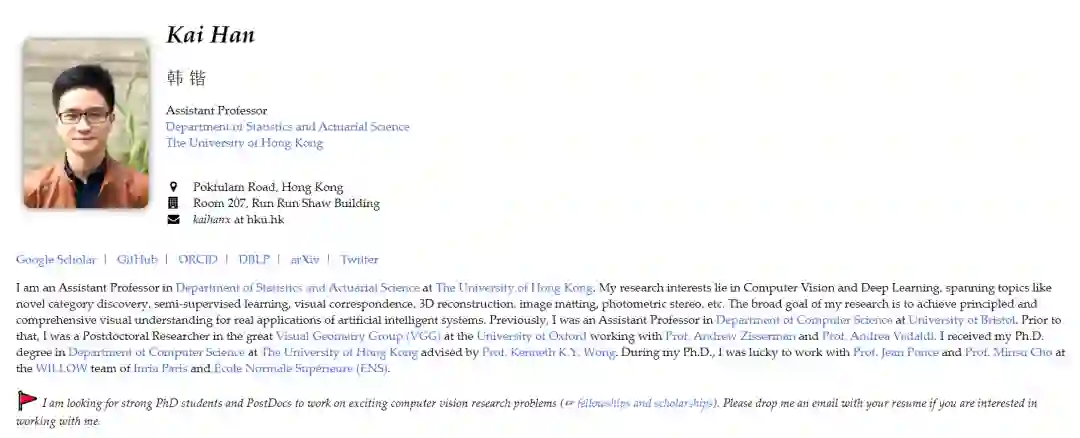 加入港大之前,他在 Google Research 担任 Visiting Faculty Researcher;在英国布里斯托大学计算机系担任助理教授;在牛津大学著名的 VGG 组进行博士后研究,师从 Andrew Zisserman 教授和 Andrea Vedaldi 教授。
