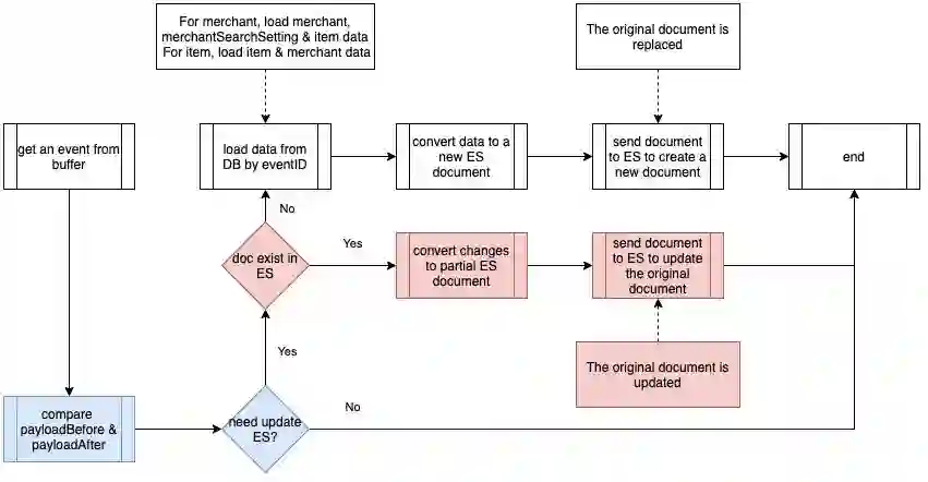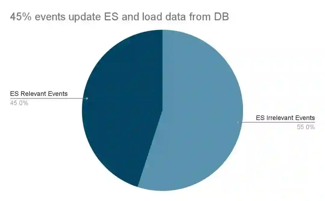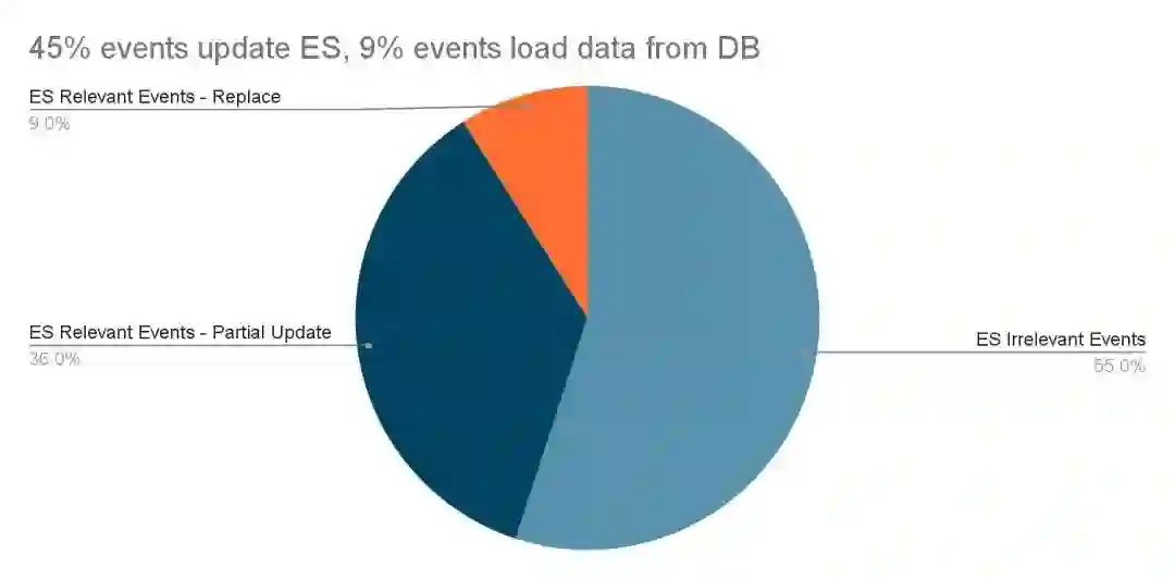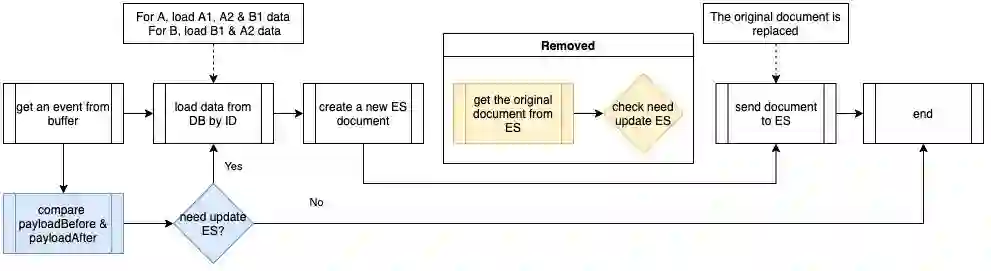 事件中的 PayloadAfter 提供了更新的数据。因此,我们开始思考是否需要一种全新的从多个 MySQL 表读取的 Elasticsearch 文档。第二个优化是利用二进制日志事件的数据差异,改为部分更新。