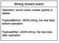 二进制日志流事件定义是一种普通的数据结构,包含三个主要字段:Operation、PayloadBefore 和 PayloadAfter。Operation 的枚举是创建、删除和更新。Payload 是 JSON 字符串格式的数据。所有二进制日志流都遵循相同的流事件定义。利用二进制日志事件中的 PayloadBefore 和 PayloadAfter,在数据同步平台上对增量同步进行优化成为可能。