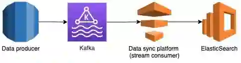 上图描述了使用 Kafka 进行数据同步的过程。数据生产器为 MySQL 上的每一个操作创建一个 Kafka 流,并实时将其发送到 Kafka。数据同步平台为每个 Kafka 流创建一个流消费器,消费器从各自的 Kafka 流中读取数据更新,并将其同步到 Elasticsearch。