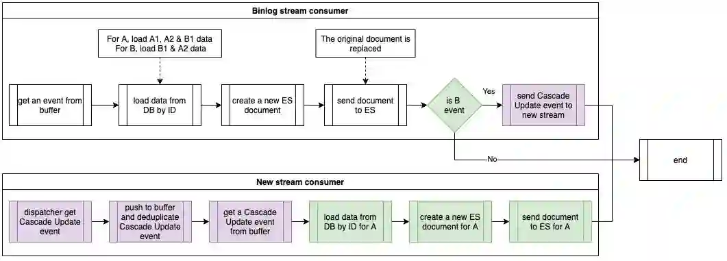 以下流程图展示了优化后的事件处理程序。绿色显示的是原始流,而紫色显示的是当前流,带有级联更新事件。在处理对象 B 的事件时,事件处理器不会直接级联更新相关对象 A,而是发送一个级联更新事件到新的流。这个新流的消费器将处理级联更新事件,并将对象 A 的数据同步到 Elasticsearch 中。