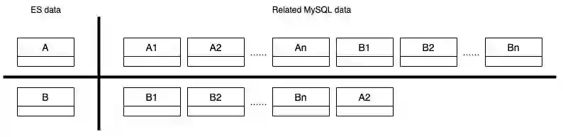 Elasticsearch 中的索引与 MySQL 表对应。MySQL 的数据存储在表中,而 Elasticsearch 的数据则存储在索引中。多个 MySQL 表被连接起来,形成一个 Elasticsearch 索引。以下代码段展示了 MySQL 和 Elasticsearch 中的实体 - 关系映射。实体 A 与实体 B 有一对多的关系。实体 A 在 MySQL 中有多个相关的表,即表 A1 和 A2,它们被连接成一个 Elasticsearch 索引 A。