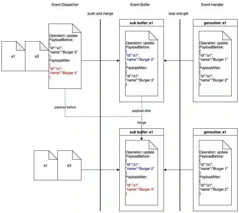 事件缓冲区(Event Buffer):事件通过主键(aID、bID 等)缓存在内存中。一个事件被缓存在缓冲区中,直到它被一个 goroutine 选中,或者当一个具有相同主键的新事件被推入缓冲区时被替换。
