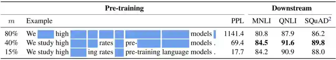 掩蔽语言模型通常使用15%的掩蔽率,研究者一般认为更高的掩蔽率会导致用来学习良好表征的上下文不足,而更低的掩蔽率则会导致训练成本太高。