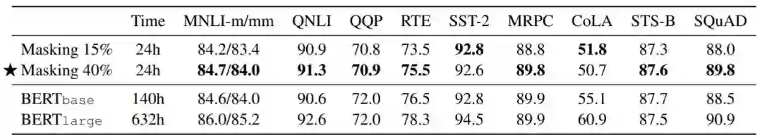 表2:大模型、高效预训练方法的条件下,15% 或40% 掩蔽率在 GLUE 基准上的测试结果对比。