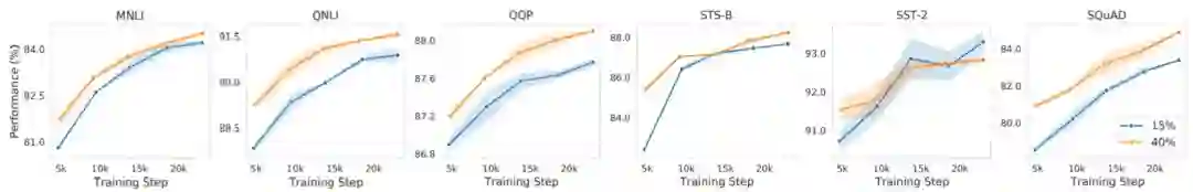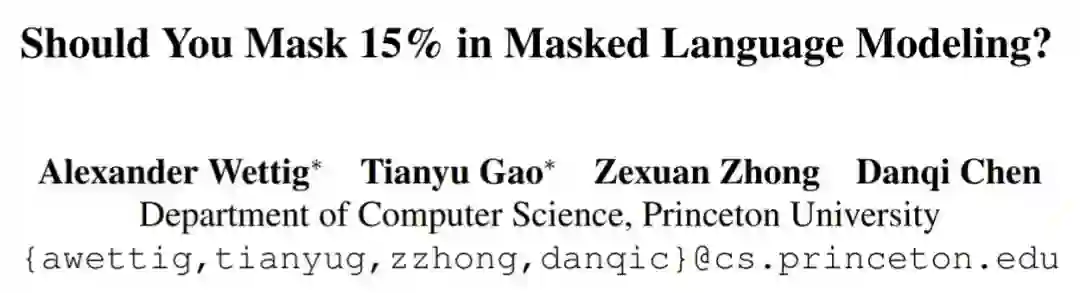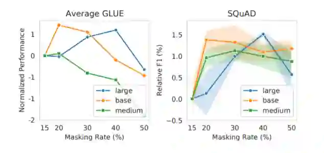 在普林斯顿大学陈丹琦等人的研究中,作者发现了与此前结论完全不同的情况:在有效的预训练方案下,他们可以掩蔽 40-50% 的输入文本,并获得比默认的 15% 更好的下游性能。