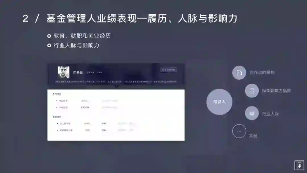 第二个是基金管理人业绩表现,我们分成履历、人脉和影响力三个部分。 FellowPlus 数据库的特点,是我们真正意义上把一级市场的投资人和投资机构,当成一类很重要的资产去管理。