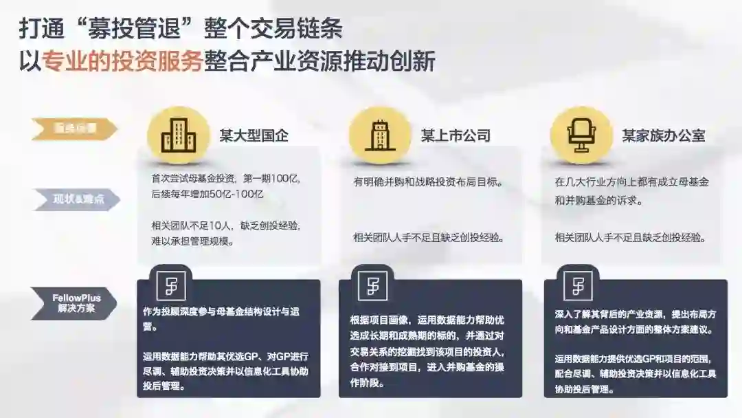 这是 FellowPlus 现在正在做的几个服务场景,我们希望通过这个方式打通“募投管退”的交易链,以专业的投资服务去整合产业资源来推动创新。我们可以看到,比方说国企、上市公司和家族办公室,当然这个背后其实都有真实的案例,但是因为 confidential 的原因,我们不能告诉各位具体是谁。因为今天有很多朋友探讨到商业化的问题,所以想在这个地方跟大家分享一点点 FellowPlus 所做的尝试。谢谢大家。