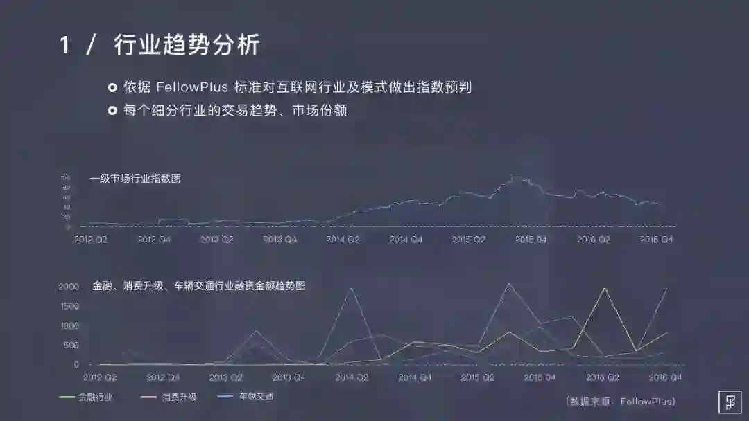 我们在做行业趋势分析这个产品的过程中,带有很多做 VC 的思路在里头。我们依靠 FellowPlus 标准,对互联网行业以及模式做出指数性的预判。第二个是我们在每个细分行业的交易趋势和市场份额上面,做了一些收集,因为在做这个产品之前,产品负责人跟我非常深度地探讨了一下,究竟投资人是怎么去判断一个行业的趋势,我跟他讲了非常多做投资的故事。举个最简单的例子,比方说我以前是投资电子商务行业的,对于这个行业来说,你想知道很多实际的交易情况,比如一些公司的营业额、利润是非常困难的。作为一个投资人,我希望能够找到这个行业的价值洼地,就是那些运营能力极强,但是在市场上因为品牌力弱而被低估的一些公司,有没有可能用我们的数据库去找到这样的投资标的。有了这样的想法之后,我们就按照一种数据的方式实现出来,这是我们内部研究产品的一种方法论。