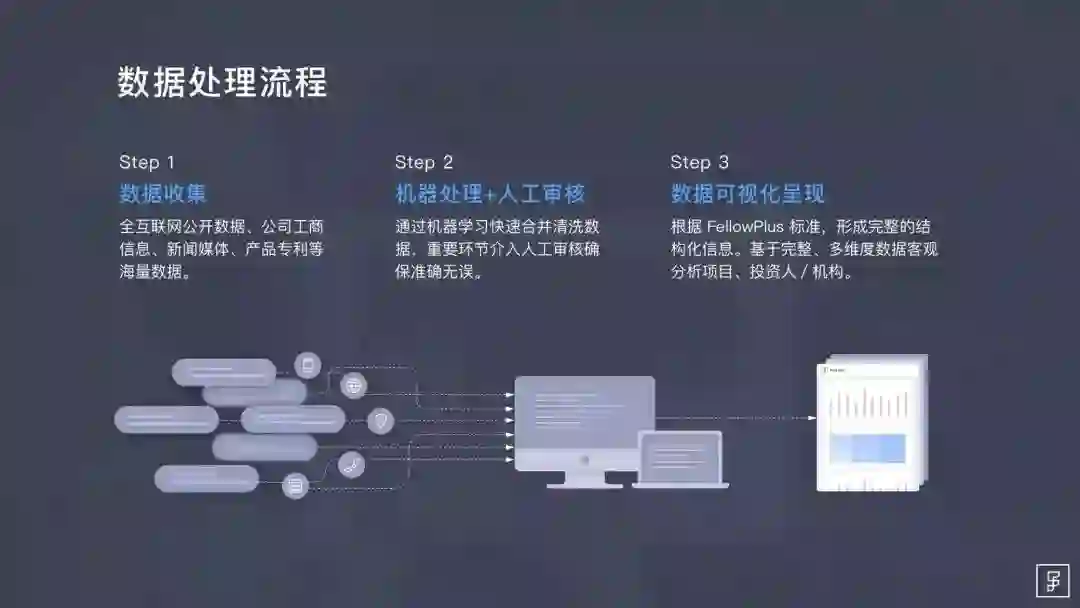 FellowPlus 在做的一件事情,就是用数据加一级市场的关键环节去量化一件事情,然后大数据加机器学习、金融建模、信息降噪和人工干预。我相信大家也关心人工干预的部分,我们现在把这个部分控制在 30% 到 40% 的范围内。这些词语,我相信在座的有很多人比我的理解会更深刻一些,我大概告诉你们,我们运用到了这样一些技术。我们做的事情实际上是两块,一块是资产披露的标准化,而不是资产标准化,一级市场的资产是不太可能标准化的;第二个是数据的可视化。