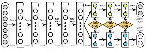 适配高层网络的代表性工作是Eric Tzeng等人在2014年发在arXiv上的《Deep domain confusion: maximizing for domain invariance》(至今没找到到底发在哪了)。这篇文章针对于预训练的AlexNet(8层)网络,在第7层(也就是feature层,softmax的上一层)加入了MMD距离来减小source和target之间的差异。这个方法简称为DDC。这篇文章概括一点说,就是适配了最高层网络,只有一层。那么,是否只适配这一层就够了呢?
