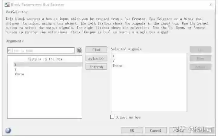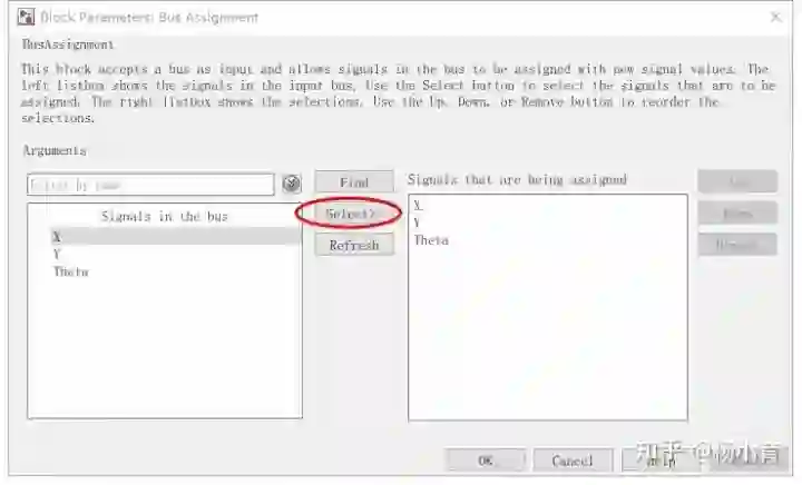 从Simulink library browser中添加bus assignment模块,并双击打开如下窗口,使用select按钮进行输出通道设置