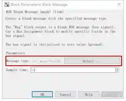 从Simulink library browser中的ROS工具箱添加空白消息模块blank message,该模块用于创建ROS消息,并双击进行参数设置
