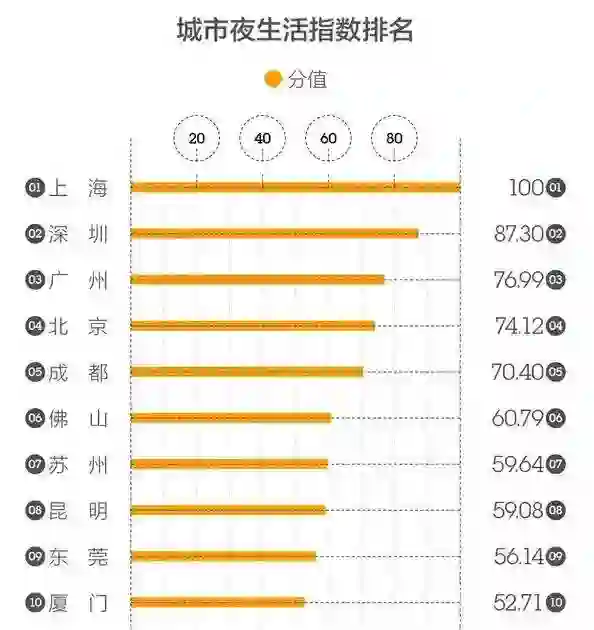 在“城市夜生活指数排名”榜上,上海的深夜指数为100,排在第一位。