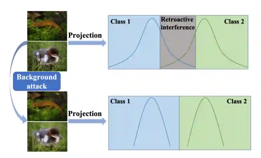 图 1 在终身学习中,现阶段的知识与以前的记忆竞争并造成干扰,尤其是当知识是相似的情况下。因此,我们在攻击两个任务中相似的内容以改变数据分布,避免倒摄抑制。