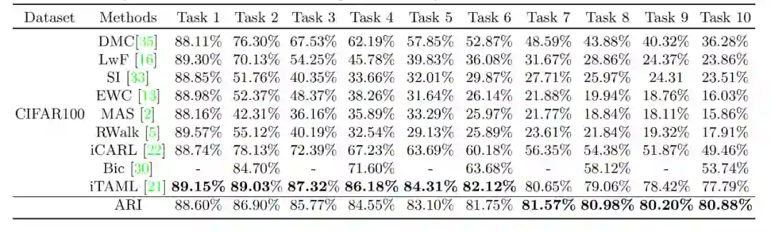在平均准确率有着明显提升的情况下,ARI有着较低的BWT以及更高的FWT。