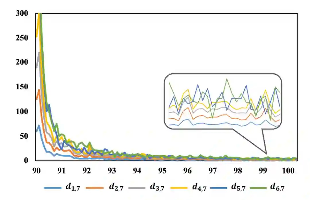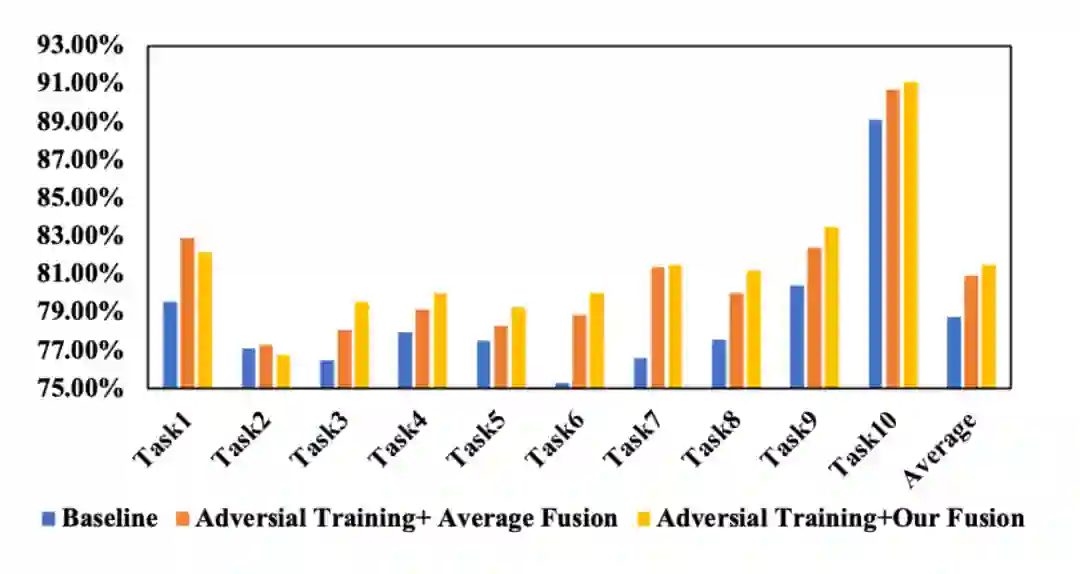 为了验证背景攻击以及模型自适应融合的有效性,我们在原始方法上依次增加背景攻击以及模型自适应融合,发现模型在学习完全部任务后对所有任务的准确率上都有着一定的提升。同时,我们绘制了模型自适应融合前针对不同任务的模型和基模型之间的距离,发现随着训练过程的进行,距离逐渐收敛到0。说明通过我们的融合策略,可以让针对不同任务的模型收敛到公共的最优点,从而缓解了模型融合过程中的信息损失。
