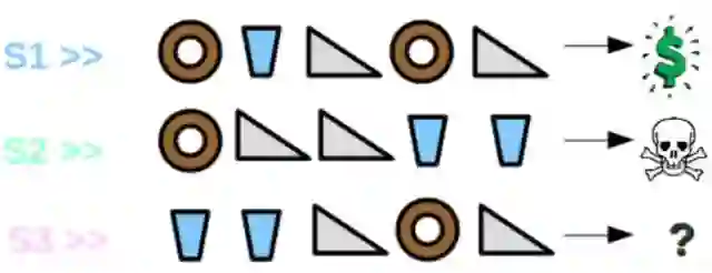 现在假设有个游戏发生在餐厅里,餐厅提供三种食物:甜甜圈、饮料和三明治。现在顾客要求服务员带五样食品,且服务员会按顺序依次提供这五样食品。如果顾客喜欢这些食物的顺序,那么服务员将得到奖励,否则就会得到惩罚。现在服务员第一次提供食物的顺序如 S1 所示,他得到了奖励。