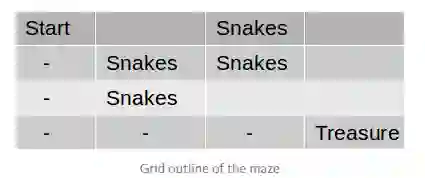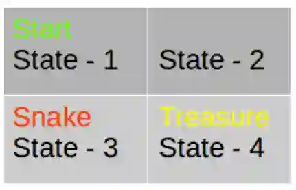 该游戏从一个给定的位置开始,即初始状态(starting state)。在每一个状态下训练实体都可以保留原地或选择向上、下、左、右移动,但不能穿越迷宫的边界。每个动作都将使得训练实体进入不同的单元格(即不同的状态)。现在在某个单元格有一个宝箱(即目标状态)。此外,迷宫的某些位置/状态有蛇。因此训练实体的目标就是通过寻找一条没有蛇的路径从起始状态走到目标状态。