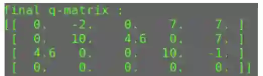 所以,现在训练主体到达目标状态 4。接下来终止该进程,并进行更多的训练直到训练主体理解了所有状态和动作,且所有的 Q 矩阵元素成为常数。这也就意味为训练主体已经尝试了所有的状态-动作对。