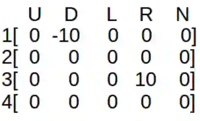 其中,因为 Q 矩阵还没有更新,max(Q(3,U) & Q(3,R)) = 0。设定设定踩上蛇的奖励为-10。现在新的 Q 矩阵的值就如下所示: